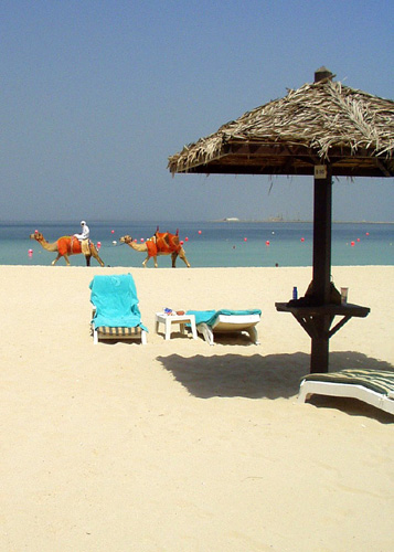 Le Meridien Hotel beach complete with camels, Marina City, Dubai, UAE.